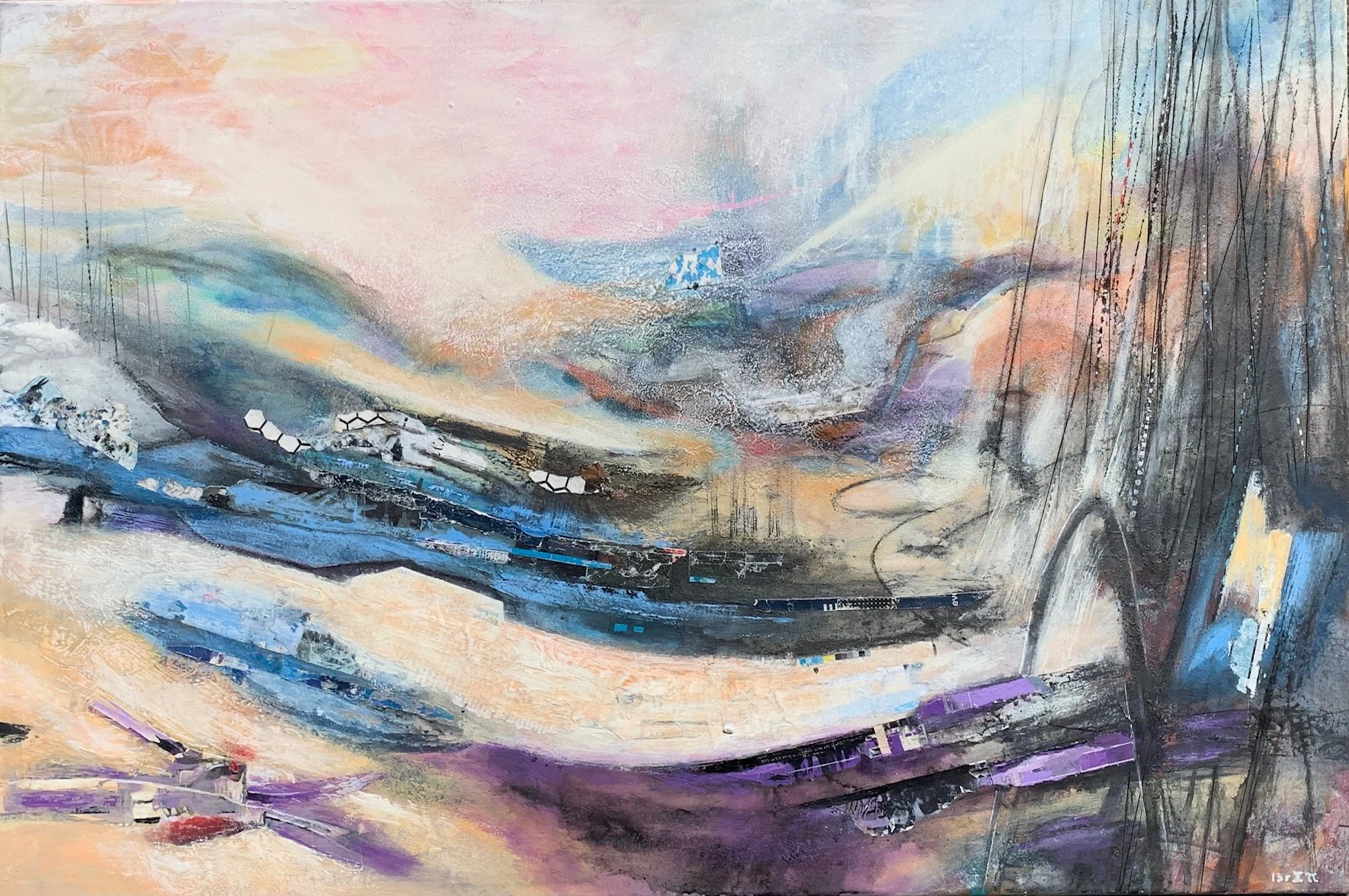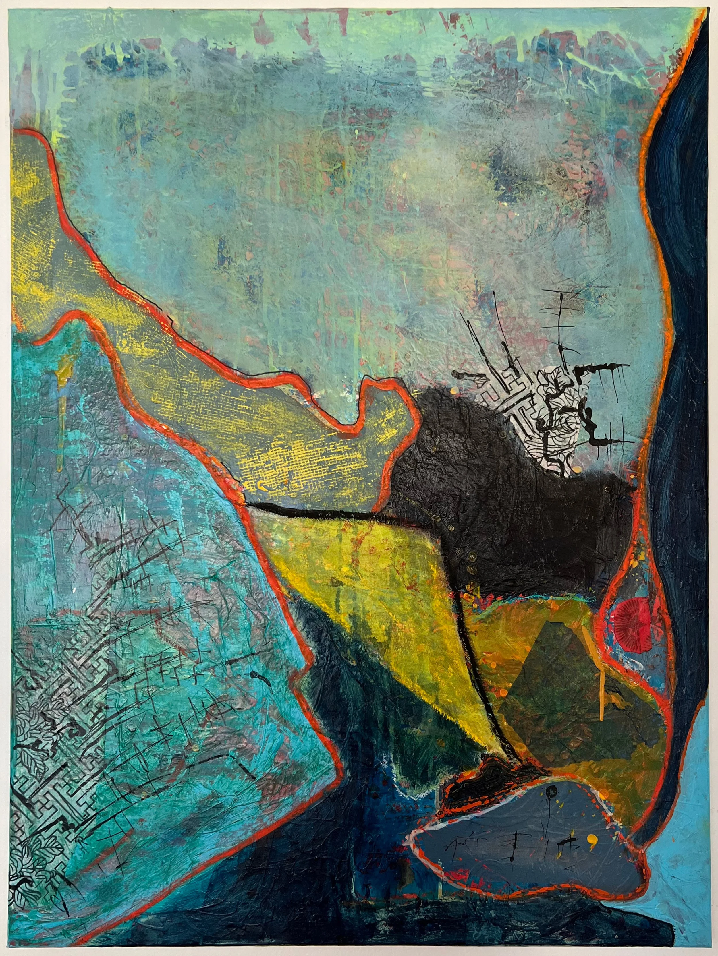 Aedan Hanley - Inside the Static, Acrylic, ink, oil pastel, 18x24, 2025, $1350 (includes float frame)