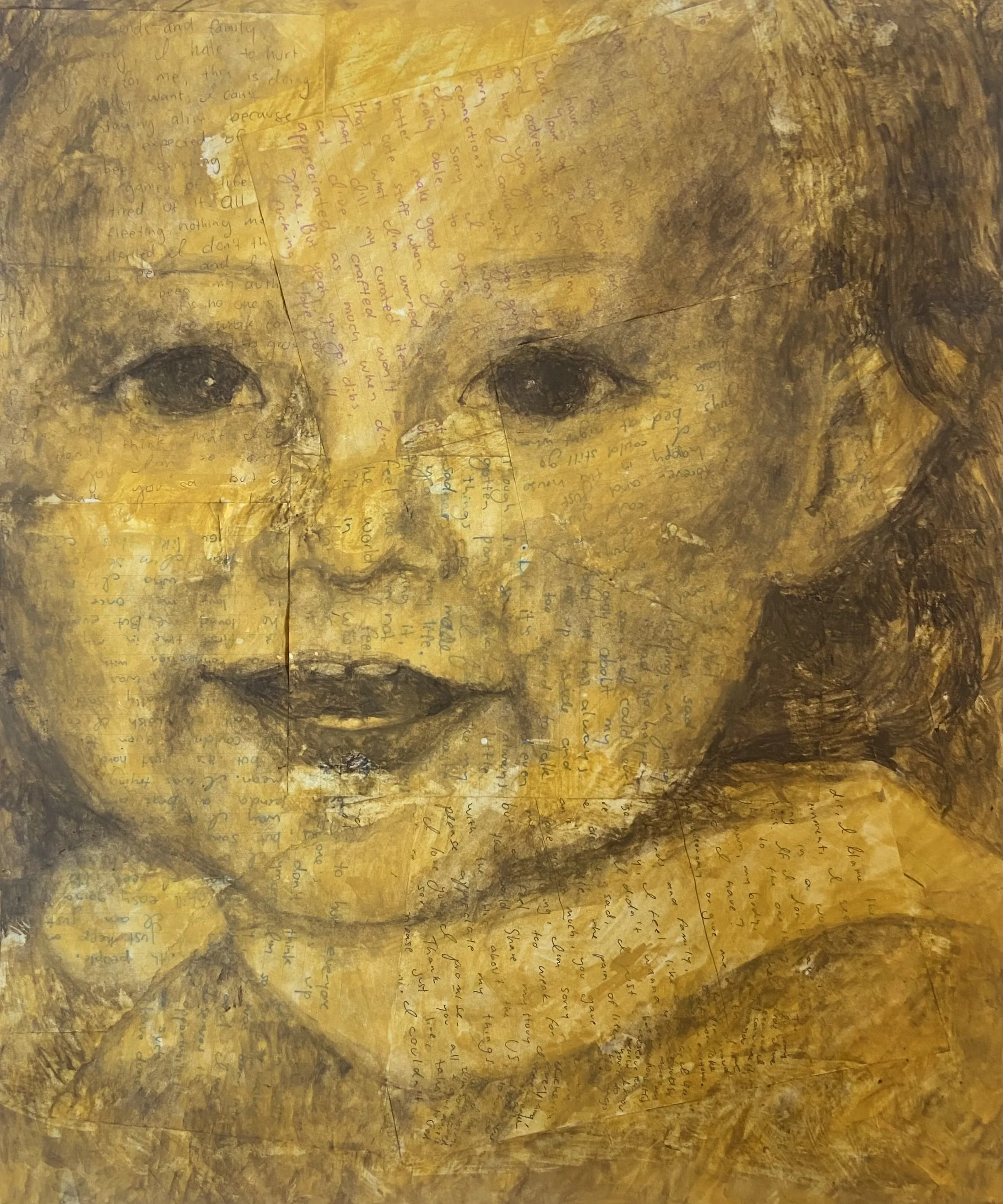 Brooke Moran - “Portrait of Child Self Painted on Old Suicide Notes”, 18.5x15.5 inches, Gouache on paper, 2025