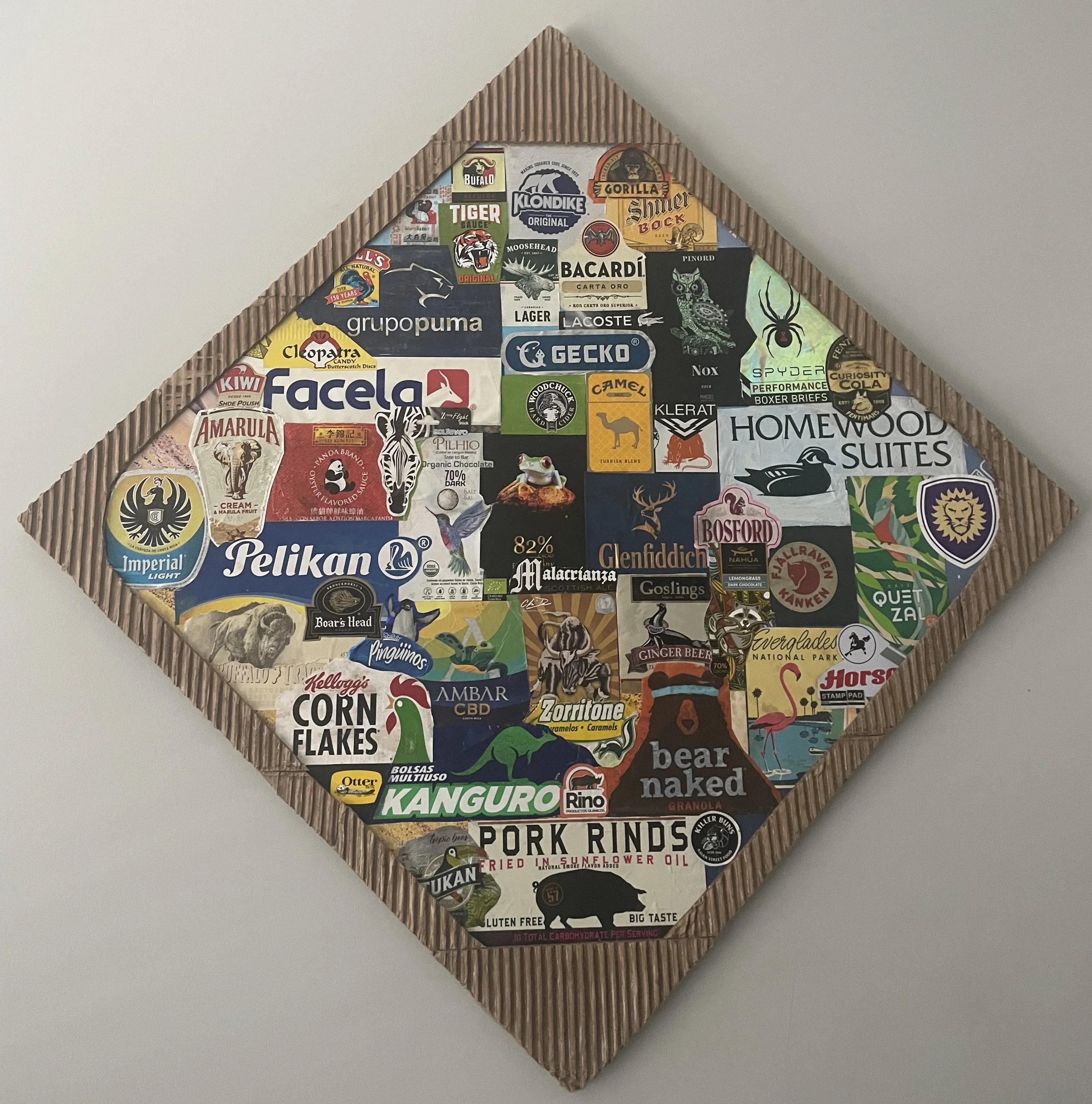 Steve Meldrom - Noah’s Ark, Inc, Collage of advertising logos with 50 + animals, Paper / plastic / aluminum logos and corrugated cardboard, 2” x 2” (24 inches x 24 inches - “two by two”), 2024-2025