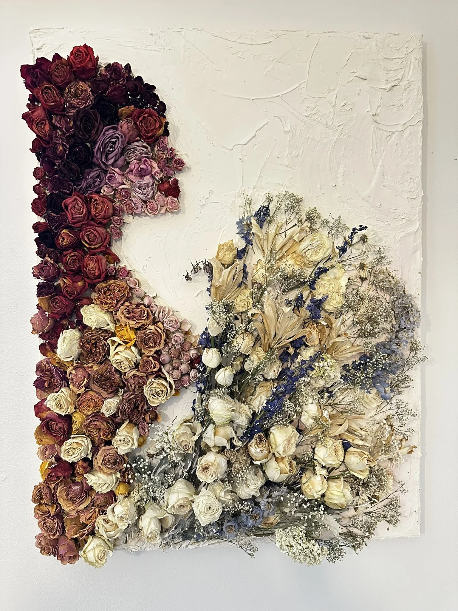 Grace Diaz - WHAT SHE HIDES, Plaster & dried flowers on canvas/Mixed Media (40X30in canvas), 2025